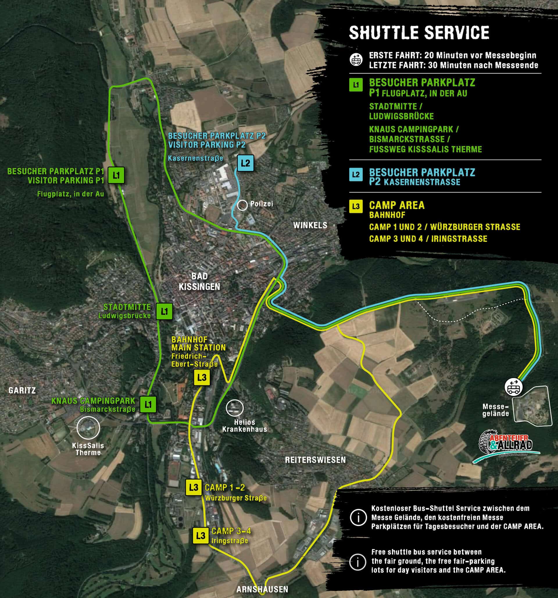 - L1 — parte dal parcheggio P1, ricavato nell’area del piccolo aeroporto locale (campo d’aviazione per aerei leggeri e voli privati, che durante la fiera mette a disposizione i suoi ampi spazi). La navetta percorre poi il centro città e il Knaus Campingpark con le terme KissSalis prima di arrivare in fiera. Comoda per chi vuole combinare la giornata alla fiera con una passeggiata in centro.