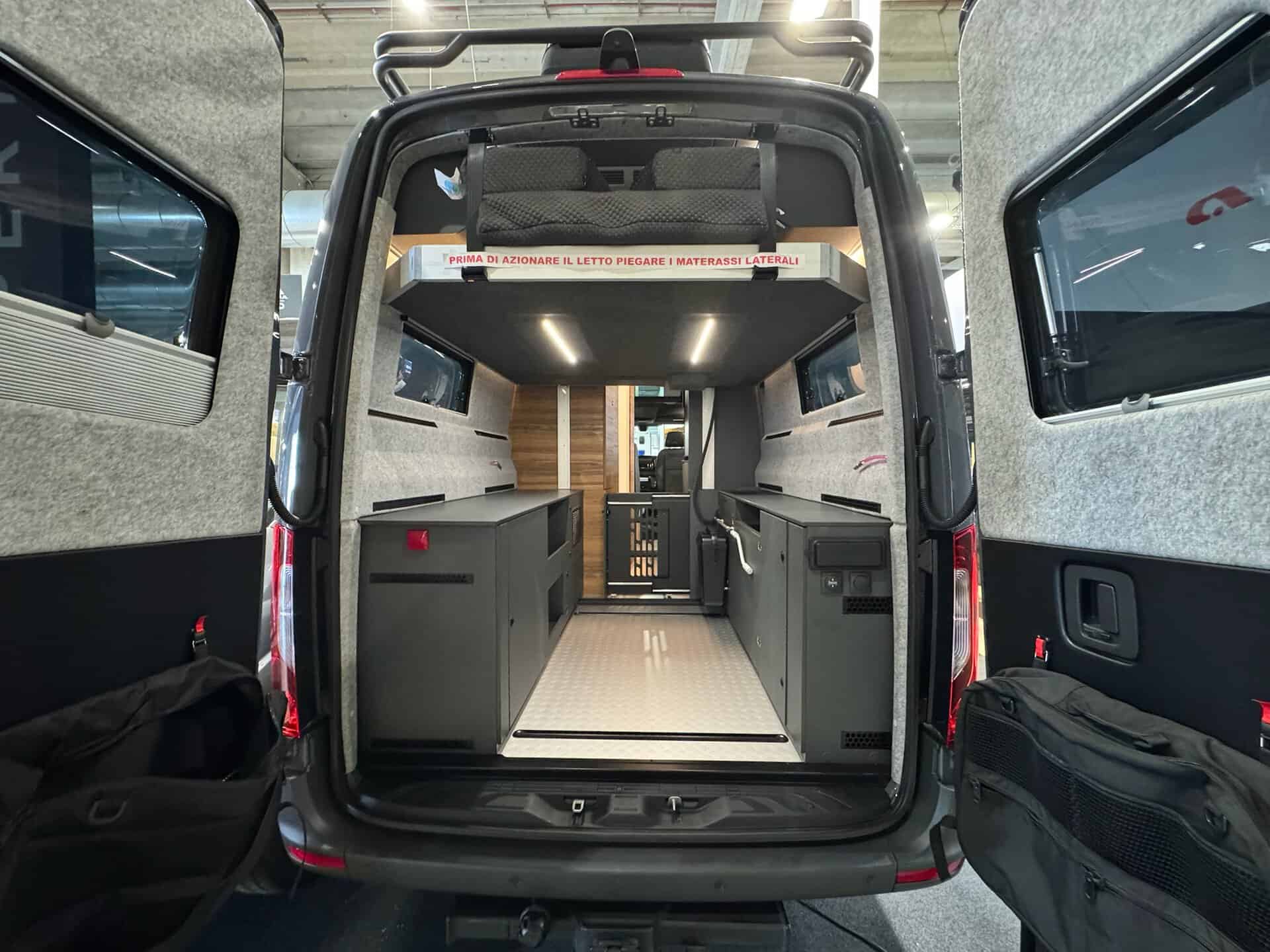 Nel 600 trovi un letto trasversale pieghevole da 196×140 cm. Non è il matrimoniale king size, ma per due persone normali va benissimo. E soprattutto, quando lo pieghi hai tutto lo spazio del van a disposizione. Il gavone sotto il letto è enorme, ci infili bici, tavoli, sedie, attrezzatura da montagna senza problemi.