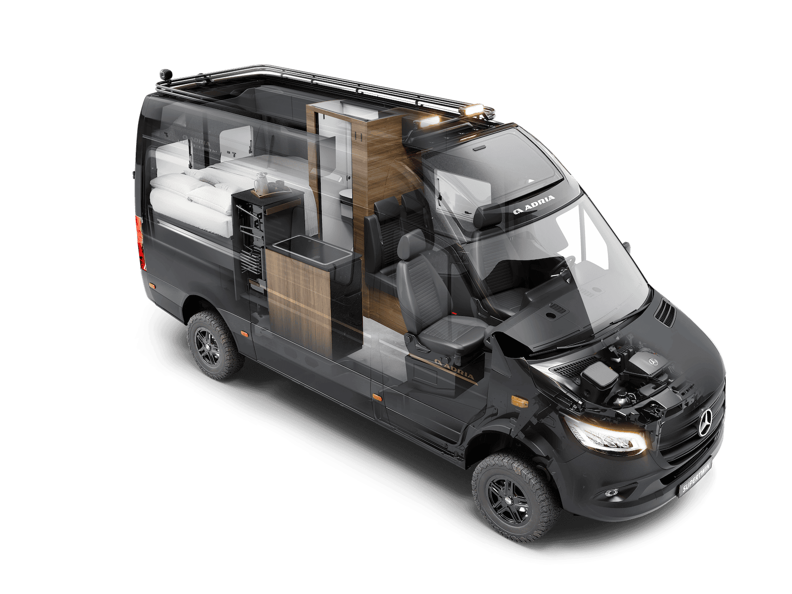 Entriamo subito nel vivo: questi Supertwin, come tutti i 4×4 del Salone, non sfuggono alla sindrome “look da expedition”. Ruote tassellate, assetto rialzato, protezioni varie: il mercato richiede questo dress code e Adria si adegua. Dress code che è anche necessario per la destinazione d’uso. La differenza non sta nell’estetica, ma in quello che non si vede: materiali e assemblaggio.