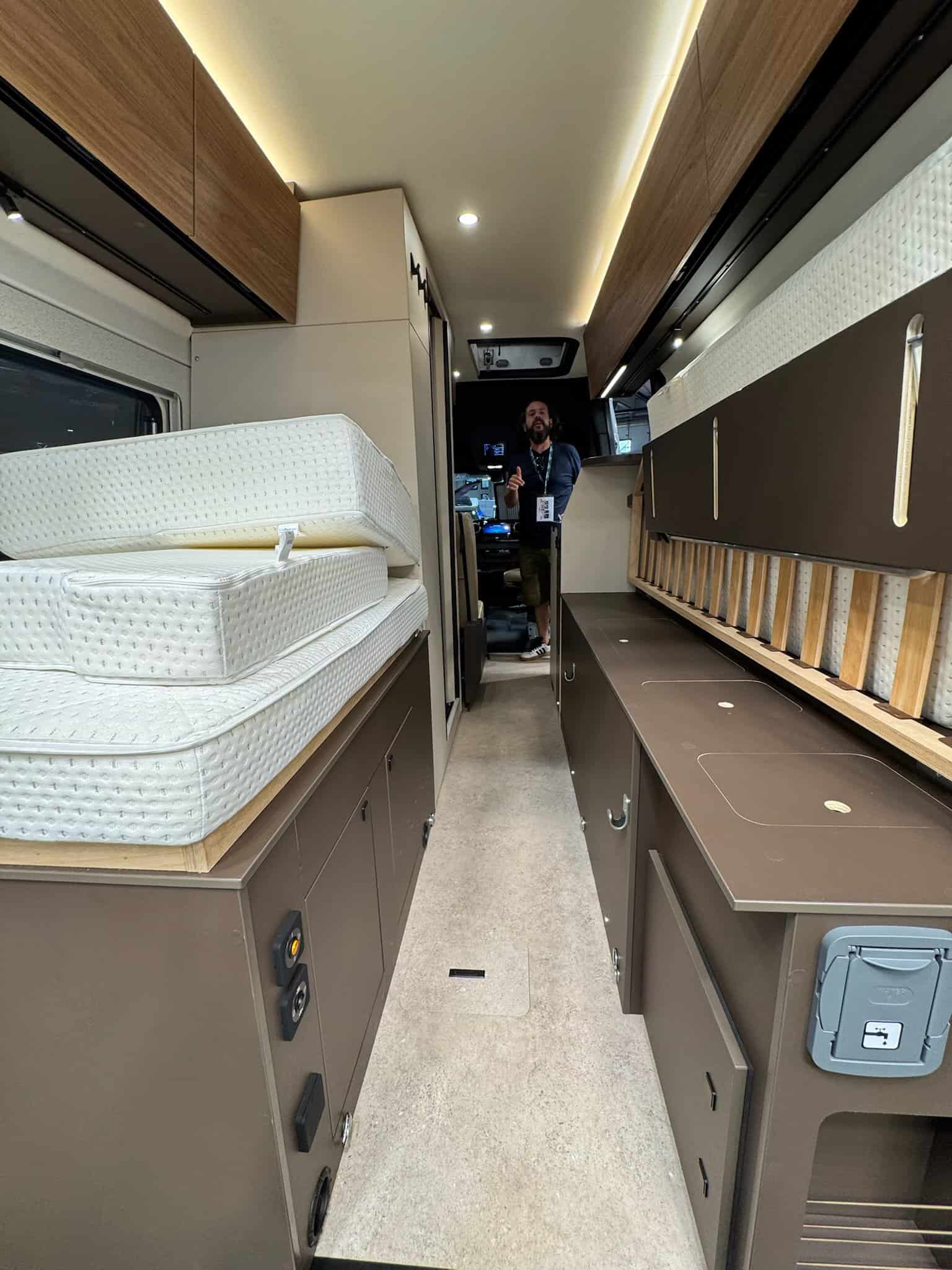 La vera rivoluzione? Il bagno che scivola via quando non serve. Un sistema meccanico che trasforma gli spazi: bagno completo quando serve, open space quando dormi. Finalmente una novità interessante, anche se resta da verificare l’effettiva comodità sul lungo periodo.