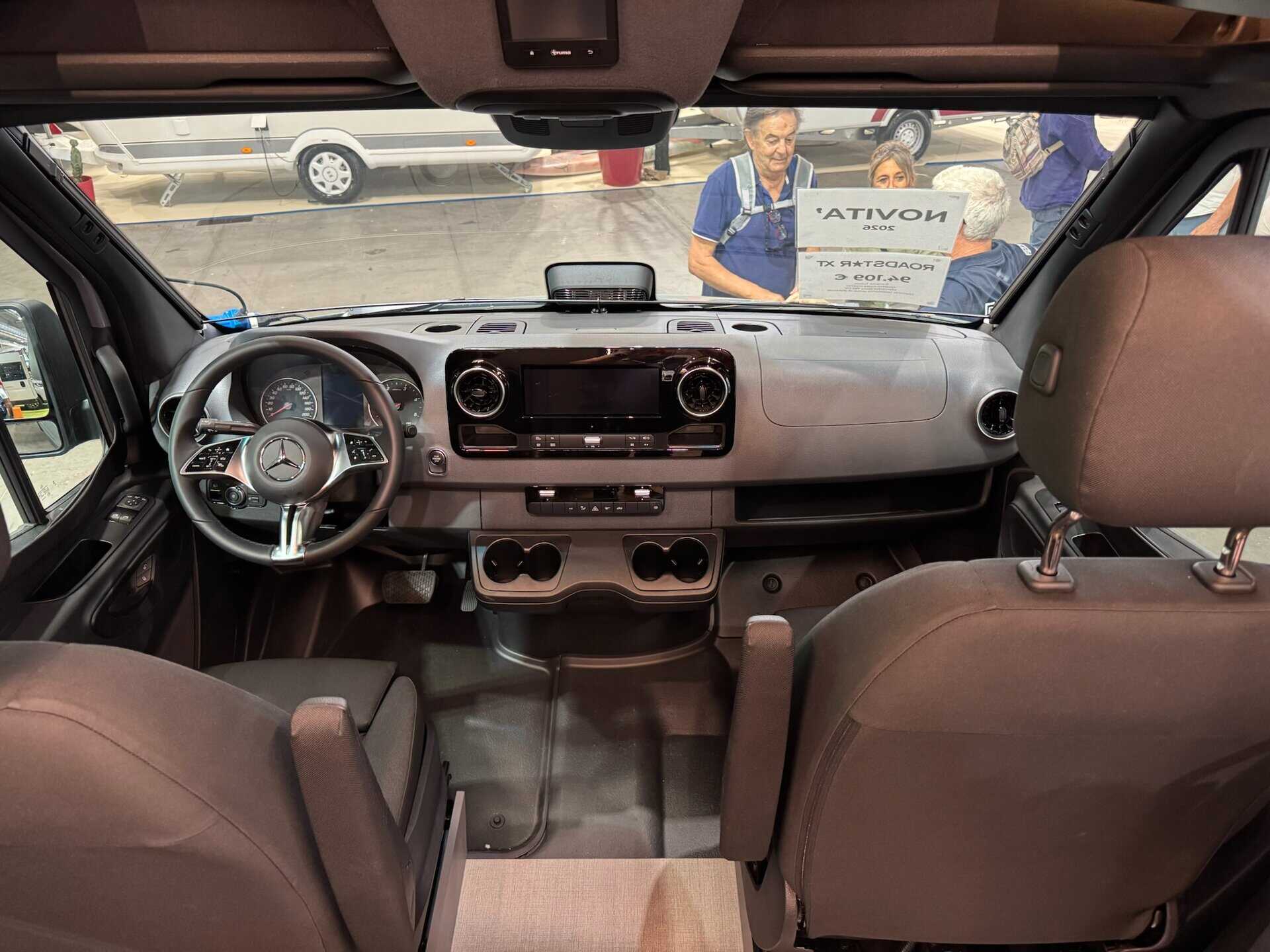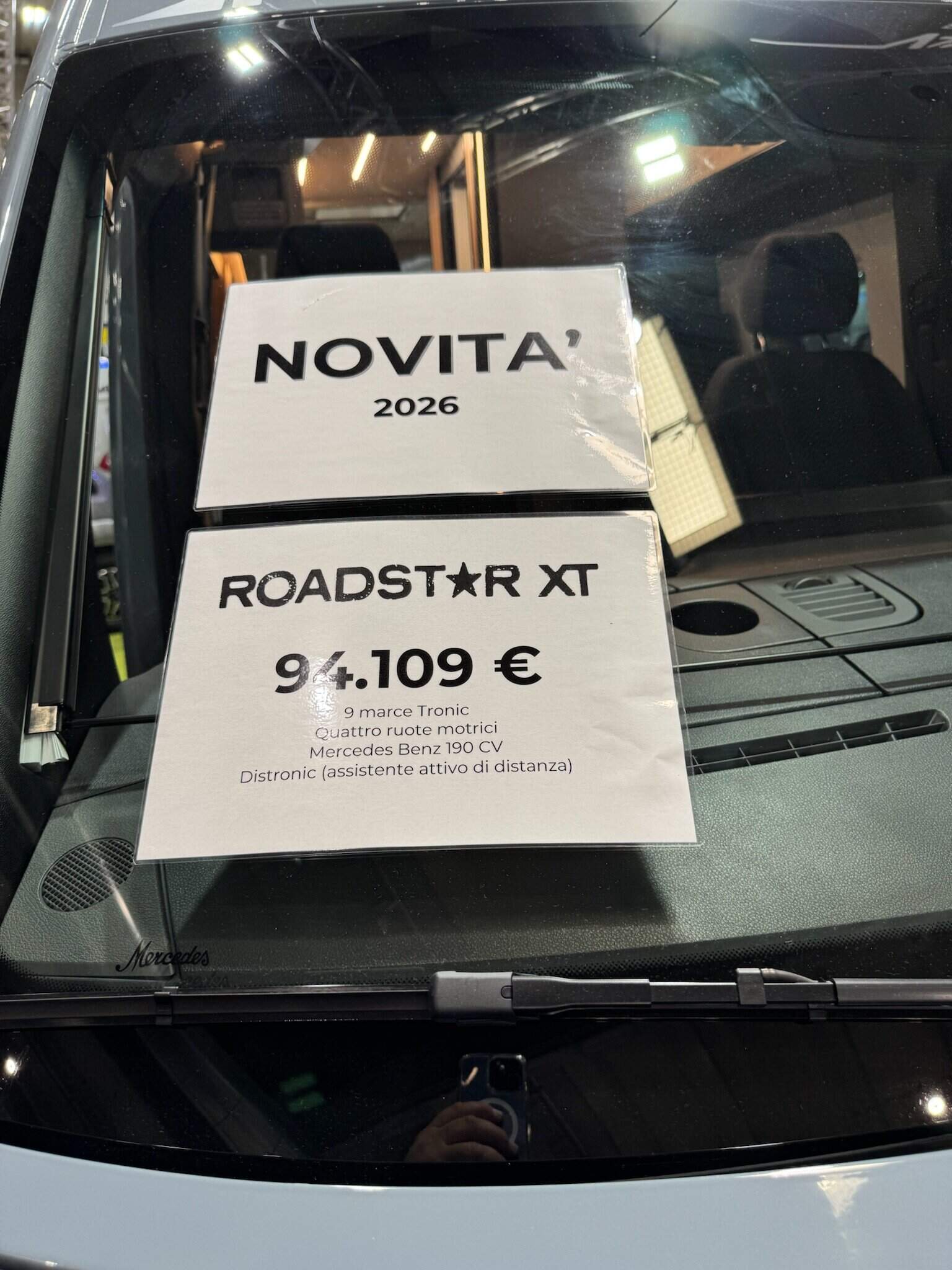 Pössl ha scritto il prezzo in grande sul parabrezza per sottolineare il divario con Adria Supertwin (138k), Hymer Grand Canyon S (137k) e Dethleffs Globebus (128k). Strategia di marketing comprensibile, ma poco onesta.