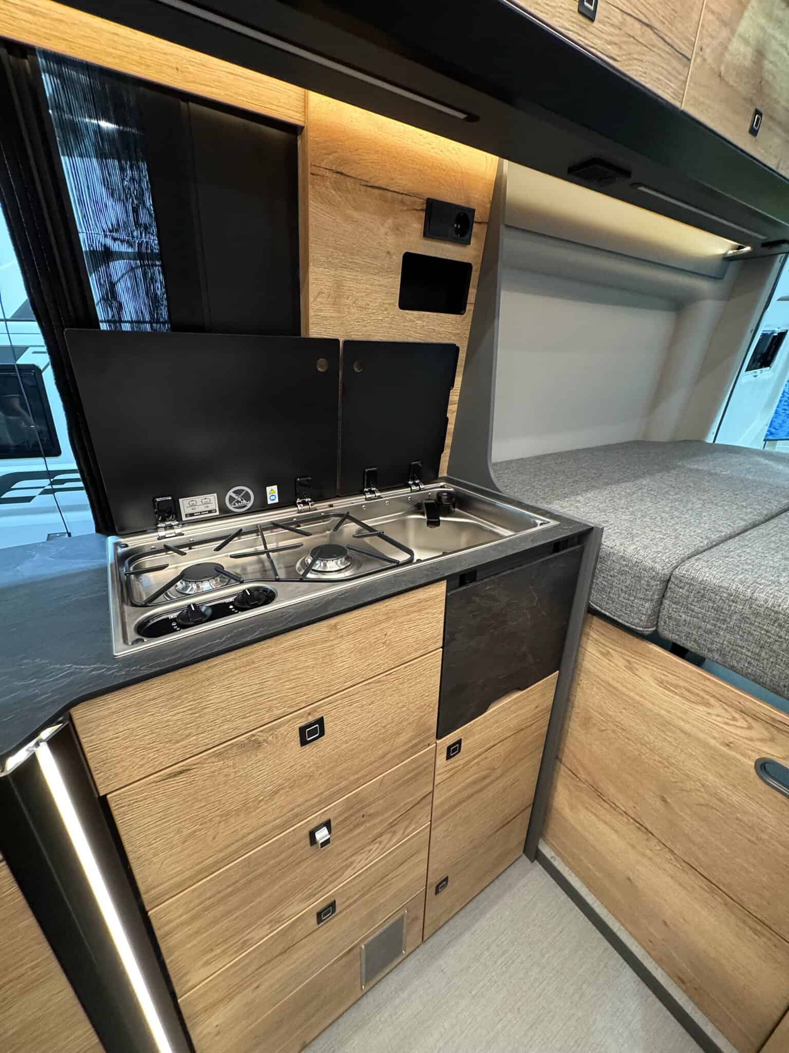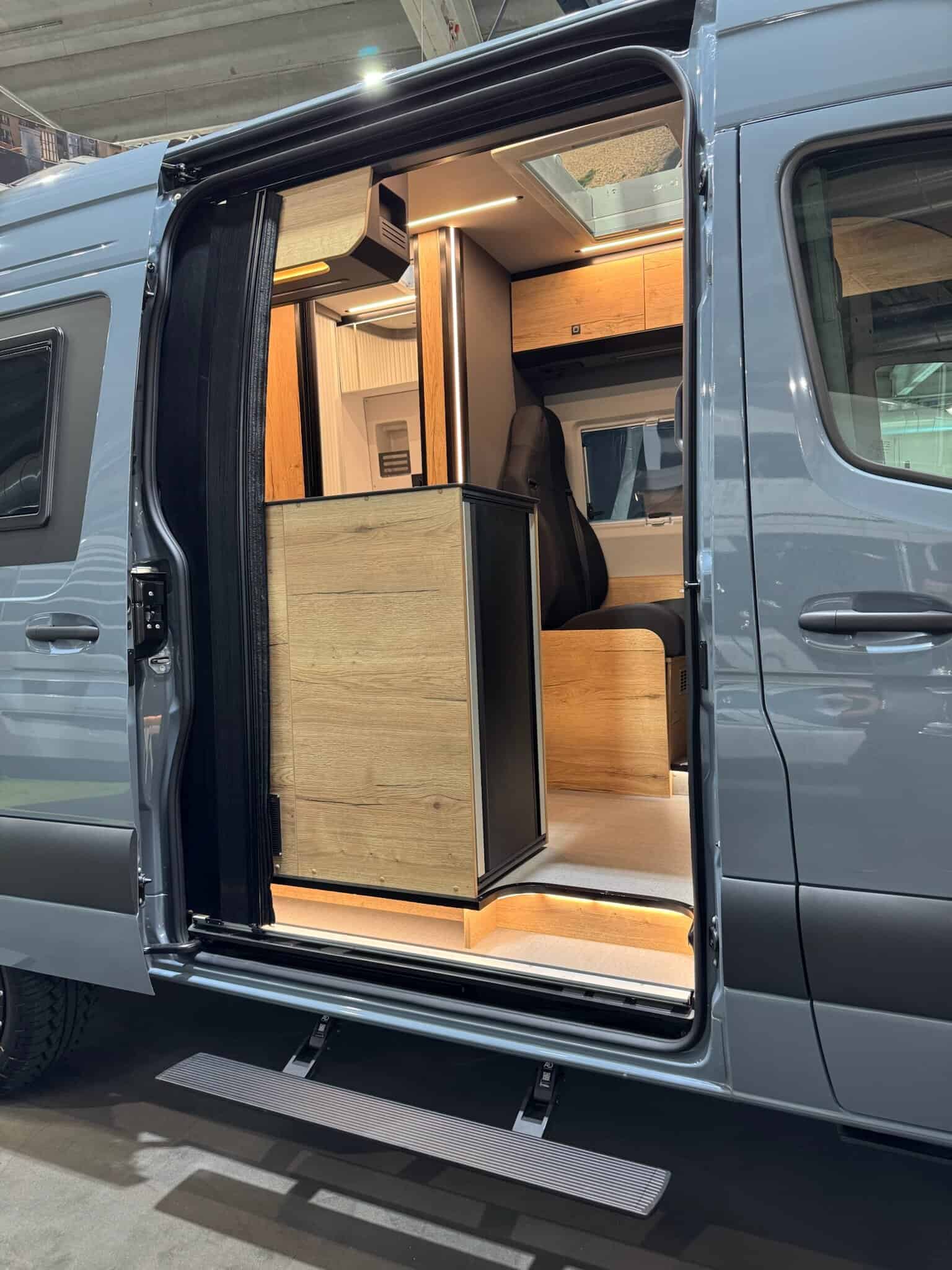 Gli interni puntano sull’atmosfera calda: legno scuro Mokka, LED ovunque, look “country premium” che funziona. L’idea di fondo è buona: un van Sprinter 4×4 più accessibile senza rinunciare alle soluzioni intelligenti.