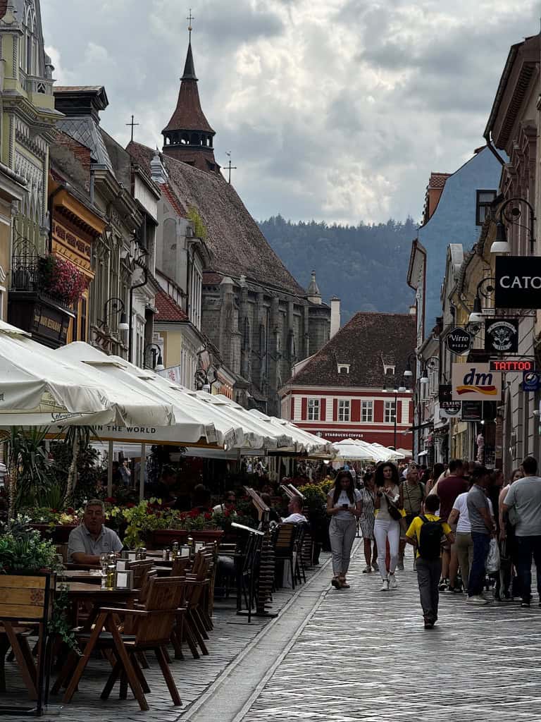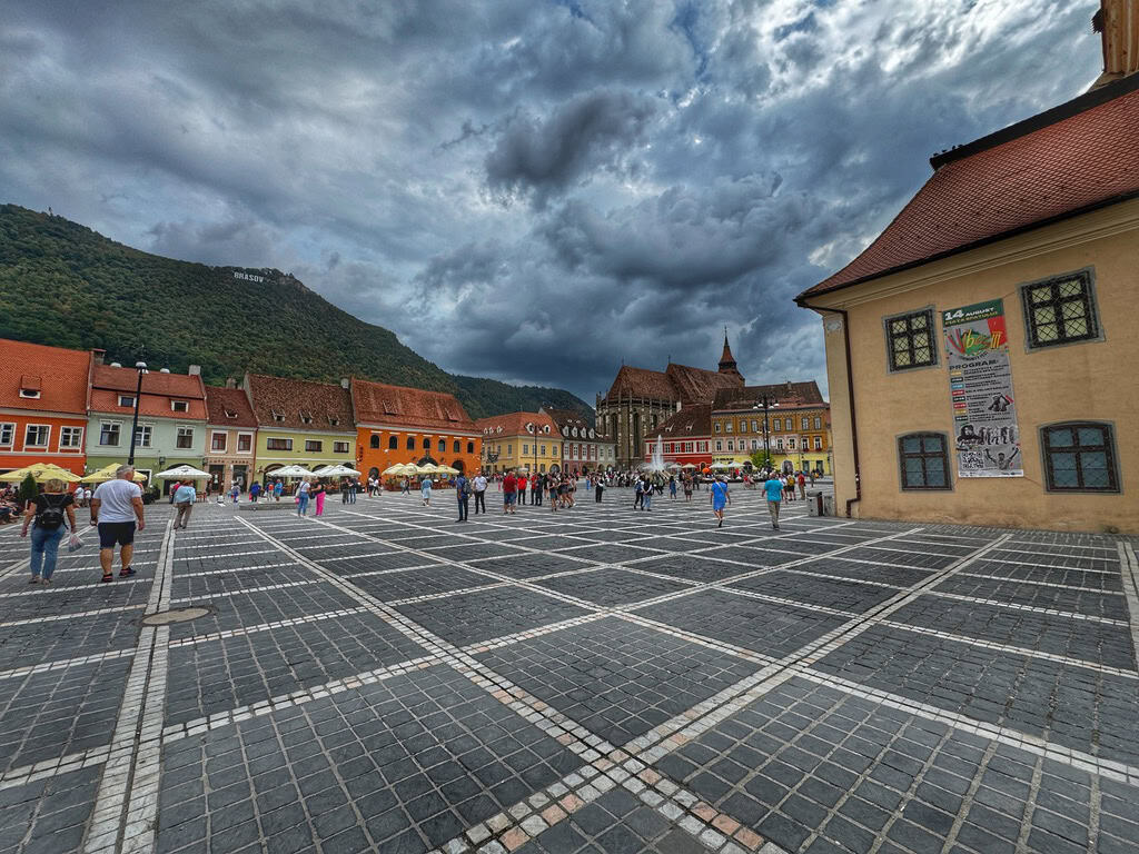 Dopo le montagne selvagge della Transfăgărășan, l’arrivo a Brașov è stato come entrare in una cartolina ordinata, pulita, luminosa. Situata nel cuore della Transilvania, questa città conserva l’anima sassone che le diedero i coloni tedeschi nel Medioevo, con un centro storico armonioso, case colorate dai tetti rossi e una sorprendente atmosfera alpina che la rende unica.