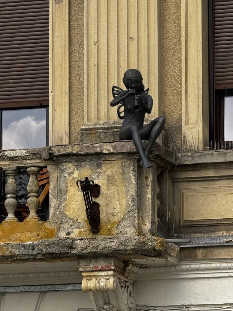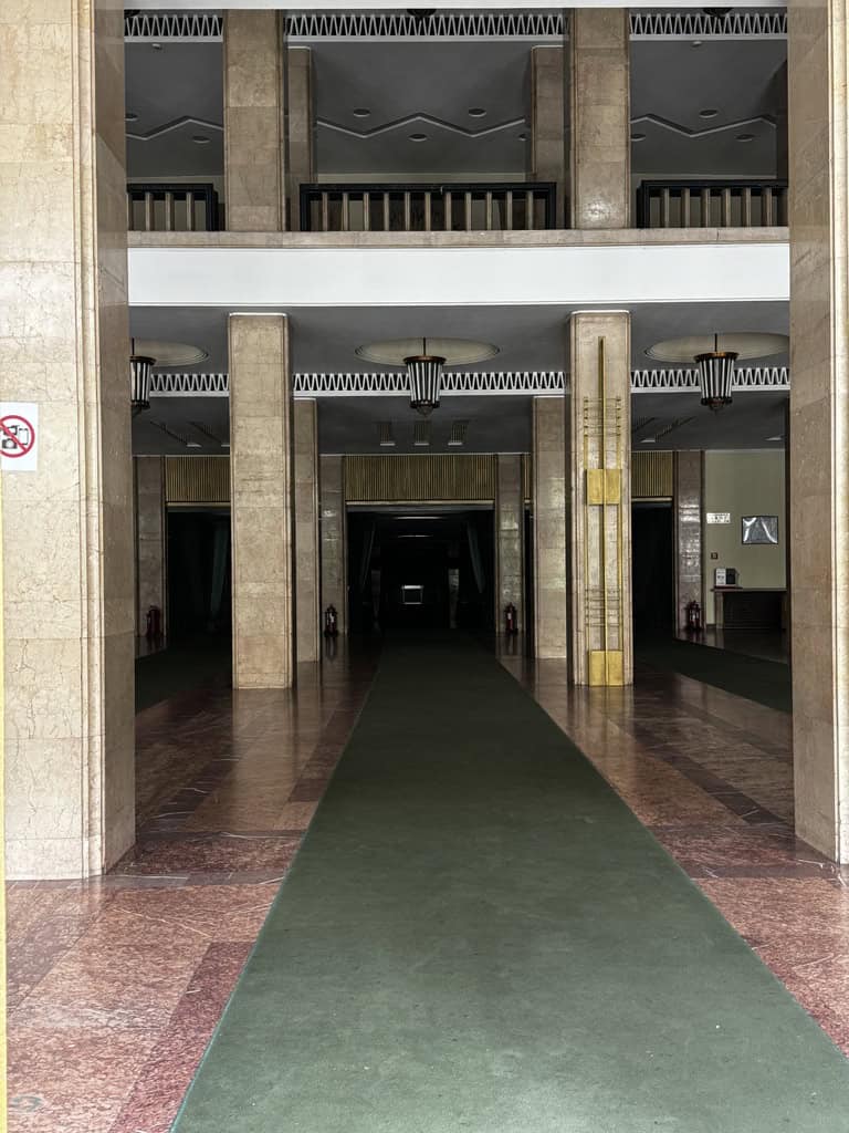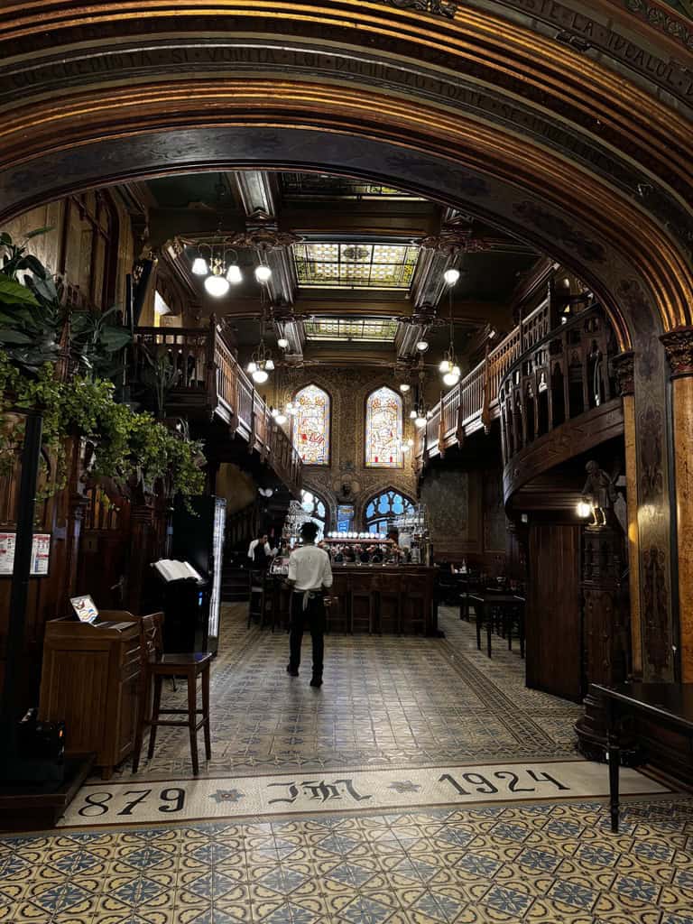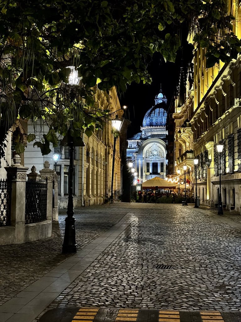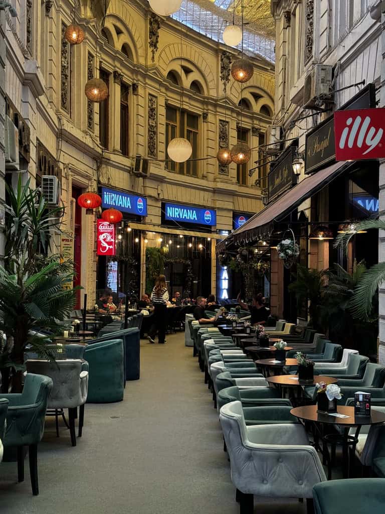 Terminato lo spettacolo, ci siamo immersi nella zona di Lipscani, il cuore pulsante della movida serale. I vicoli stretti brulicavano di giovani, musica, tavoli all’aperto e luci soffuse. Abbiamo cercato di cenare presso lo storico Hanul lui Manuc, ma non abbiamo trovato posto. Ci torneremo, magari in un weekend dedicato: il locale merita una visita anche solo per la sua architettura e l’atmosfera d’altri tempi. Alla fine abbiamo ripiegato su un’altra istituzione locale, il Caru’ cu Bere, ristorante simbolo della città, ospitato in un edificio in stile neogotico con interni riccamente decorati. Anche se oggi molto turistico, conserva un fascino scenografico e rappresenta una delle esperienze “storiche” da vivere almeno una volta.