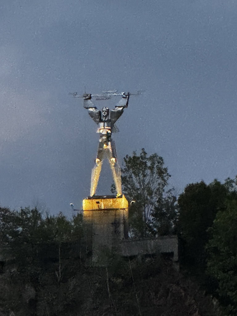 Sulla diga, una statua di Prometeo in metallo guarda l’orizzonte con fierezza, un po’ kitsch ma decisamente scenografica.