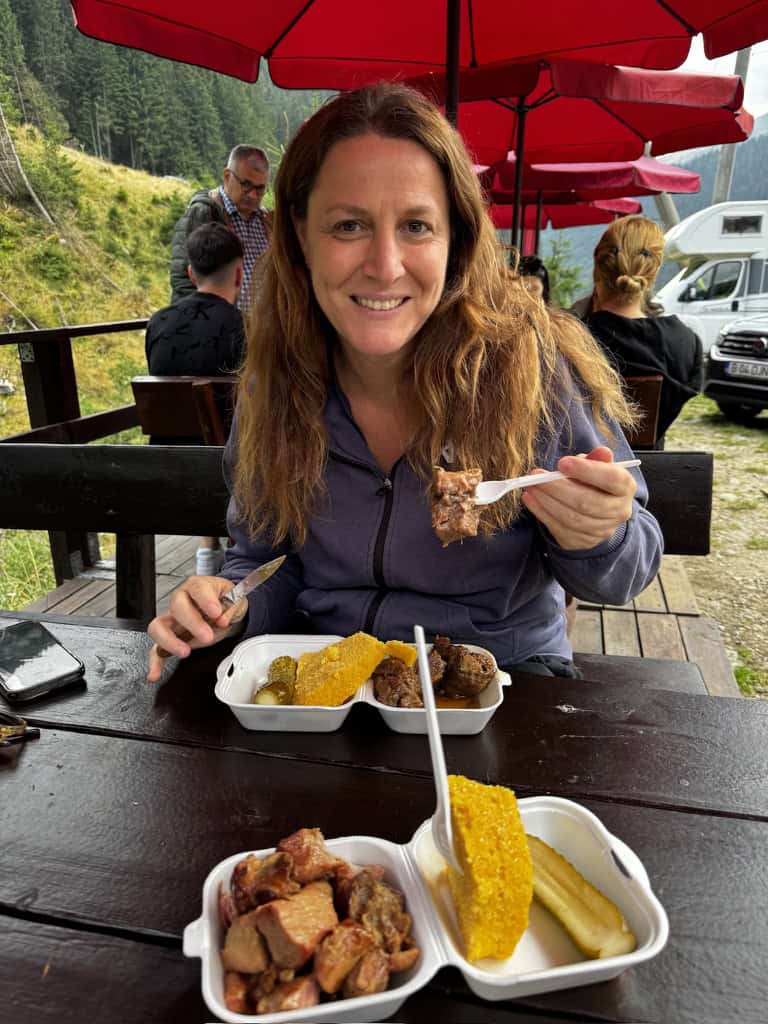 Abbiamo ordinato due zuppe tipiche: una ciorbă de oaie (zuppa di pecora), intensa, affumicata, con un sapore rustico che sembrava cucito addosso a quelle montagne; e una ciorbă de porc (di maiale), più morbida ma altrettanto ricca.
