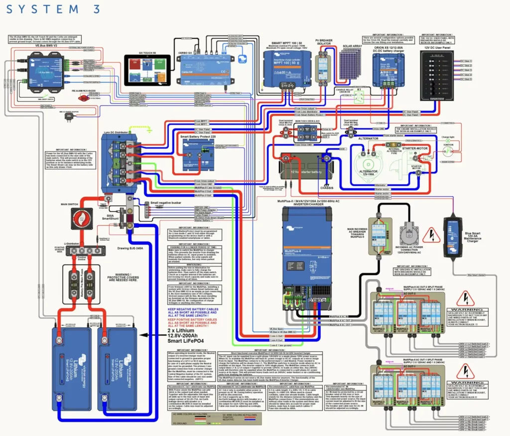 Abbiamo scelto una configurazione ispirata ad una soluzione di esempio disegnata da Victron Energy per Camper di media dimensione, pensata per supportare il nostro stile di viaggio e offrirci la possibilità di essere autonomi per alcuni giorni anche durante le lunghe giornate di smart working.
